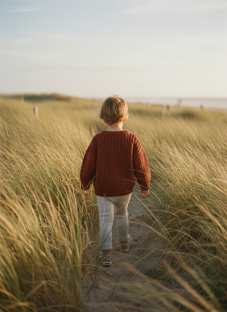 This warm and cosy rust chunky knit jumper is crafted from 100% soft cotton yarn, offering a breathable and comfortable layer for cooler days. The textured chunky knit brings a timeless, seasonal feel — perfect for autumn walks, playtime at home or layering through the winter months. Its relaxed fit gives little ones plenty of room to move, while the cotton keeps them snug without overheating.