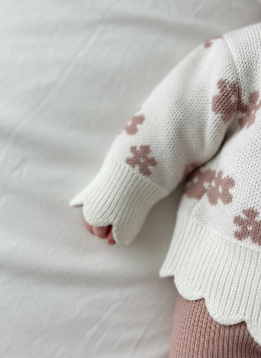 The design features an off-white base decorated with soft pink abstract floral motifs. Scallop edging at the cuffs and hem adds a playful yet elegant finish, making this jumper a standout piece for the season.