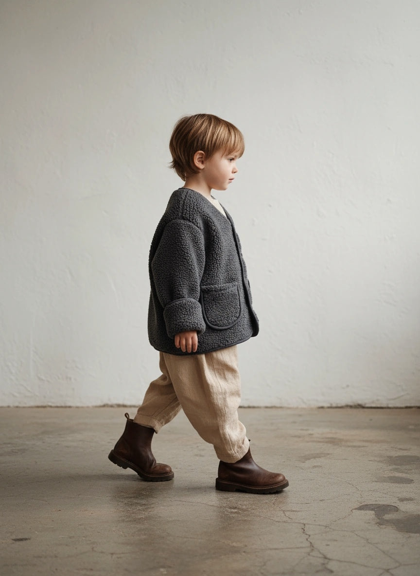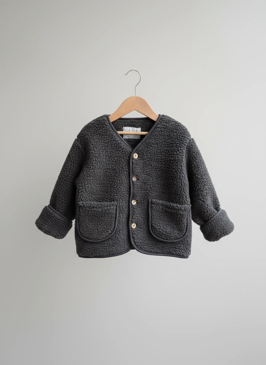 Available in two versatile shades – Khaki with brown piping and Charcoal with matching trim – it’s perfect for pairing with knit leggings or trousers. The soft sherpa texture keeps babies and toddlers warm, while the wide fit ensures easy movement and play.
